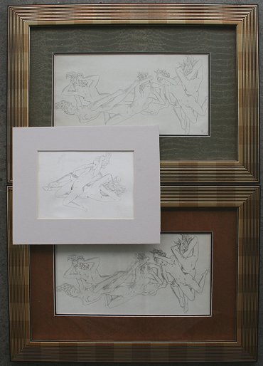 WHYTE, Raymond, (American, 1923-2002): 3 Etchings of Nudes, two matching etchings monogrammed ''RW'', sight size 5 1/2'' x 10 1/2'', matching gold frames, 12 1/2'' x 17 1/2'', smaller etching with two nudes, sight size 5'' x 6 1/2''. Sold as a lot.