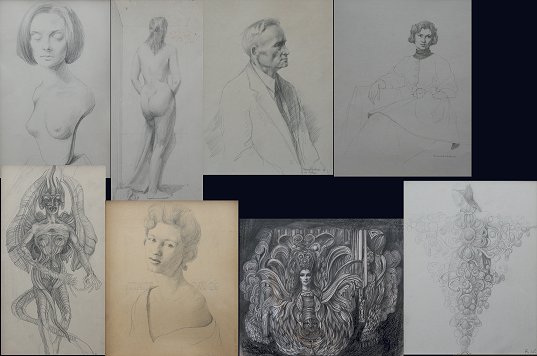 WHYTE, Raymond, (American, 1923-2002): 8 Pencil sketches including Lady, sight size 13 1/2'' x 10 1/2'', monogrammed lower right, embossed silver frame 16'' x 13''; Portrait of a seated lady, sight size 10'' x 8'', pencil signed, dated 1952, matted and framed 17'' x 13''; Portrait of an Elderly man, ''My Father'', 9 1/2'' x 7 1/2'', pencil signed and titled, dated 1953, burl wood and ebonized frame, 16 1/2'' x 12''; Woman in Incan Scene, sight size 7'' x 8 1/2'', no visible signature, framed 12'' x 15''; sight size 13 1/2'' x 7 1/2'', monogrammed lower right, embossed gold frame, 17'' x 10''; Portrait of a woman, sight size 15'' x 11'', pencil signed, gold frame 17'' x 15'', some foxing and staining in margin; Nude, 13 1/2'' x 12 1/2'', monogrammed, embossed frame 17'' x 12''; Full Nude Study, sight size 13'' x 6'', ebonize and gilt wood frame with minor wear, 19'' x 14 3/4''. Condition - Several minor abrasions, foxing. Sold as is, as a lot.