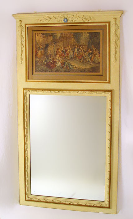 FRENCH CARVED WOOD TRUMEAU MIRROR: Later painted finish. Carved wood with later porcelain minerva head medallion (note cracks). Engraving of French courtyard scene above mirror. Frame measures 58 1/4'' high x 32'' wide. Looking glass measures 31'' x 23''.