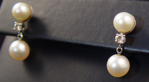 DIAMOND & CULTURED PEARL DROP EARRINGS: 14K white gold earrings contain 2 round full cut diamonds. Weight: .25 Ct. Approx. The diamonds average VS in clarity and H-I in color. Each of the earrings with 2 cultured pearls, 7.00 - 8.00 mm., cream in color, medium/high luster. The diamonds are prong set. The pearls are peg set. Post and (non gold) clutch closures. Weight: 4.5 grams. Approx. 1'' in length