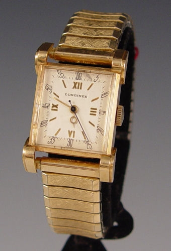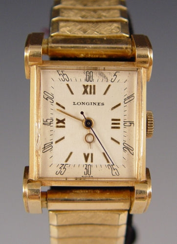 LONGINES 14K GOLD ART DECO WRISTWATCH: Solid 14k yellow gold case. Case is rectangular, measures 21mm wide and 35mm long. Watch features extra fancy Art Deco fluted lugs. Crystal is a thick rock style with extra high dome, please note chip to side. Case is heavy and extremely fine condition with factory original satin finish and patina on case back. Dial is in good condition, showing only minor ageing. Watch runs well and keeps excellent time. The watch case is signed, as well as the dial and movement, making this is a triple signed watch. The movement is a caliber 8NS with 17 jewels in extremely clean condition.