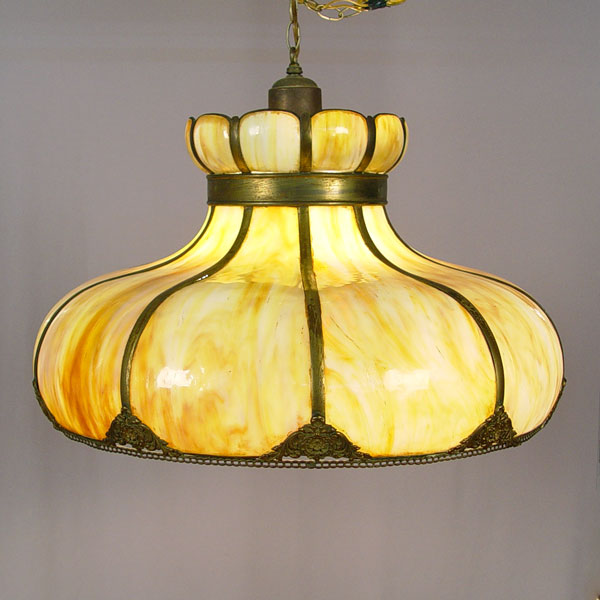 VINTAGE CONTINENTAL CARAMEL SLAG GLASS HANGING LAMP: Vintage chandelier signed Continental, 10 panels of slag glass, 3 sockets. Approx. 23'' dia., 13''h. excluding chain.