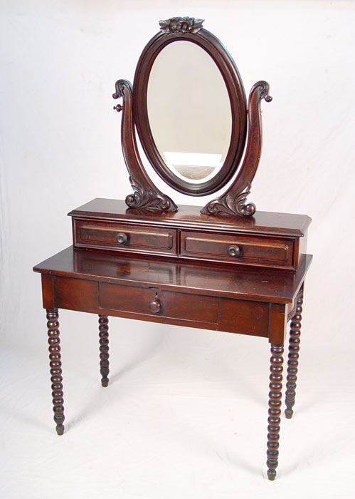 19th C MAHOGANY VANITY: The consignor tells us this charming piece was crafted by her grandfather, from a one drawer writing table with spool turned legs, serpentine sides with applied trim. A double drawer section taken from a dresser and then an oval mirror with shaped and carved harp with floral trim. 61 1/2''h. overall, 36''w. x 19''d.