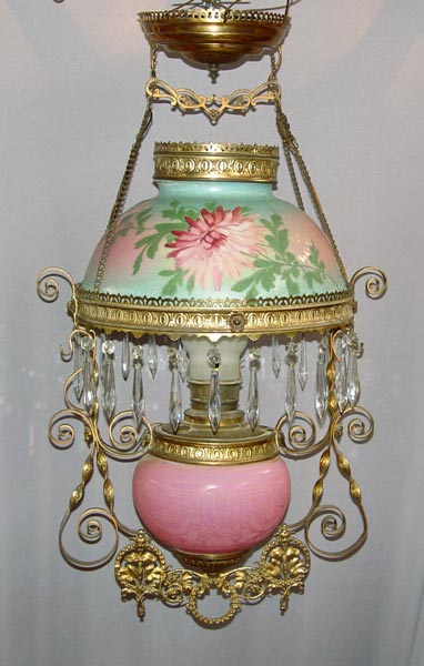 VICTORIAN HANGING LAMP CHANDELIER: Pink glass font, hand painted shade, crystal prisms. The lamp has been electrified. Shade is 14'' dia. , lamp is 30'' h. overall.