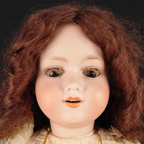 24'' ARMAND MARSEILLE DOLL IN ORIGINAL OUTFIT: Circa 1912, Made in Germany. Bisque swivel neck with brown glass eyes, fur lashes, open crown, open mouth with teeth. Wood, composition paper mache body, old clothes. Synthetic wig. Est. $300/500**