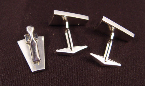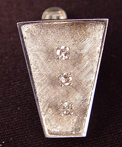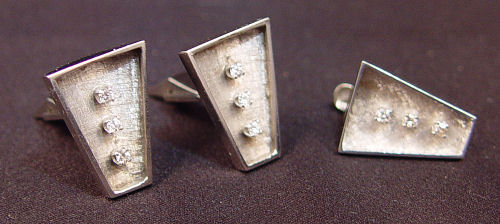 14K WHITE GOLD AND DIAMOND CUFFLINK & TIE CLIP SET: 14K white gold cufflink and tie clip contains 9 round full cut and single cut diamonds. Weight: .35 Ct. Approx. The diamonds average VS in clarity and G-H in color. The diamonds are prong set. Geometric design. Approx. 7/8'' in length. Weight: 16.2 grams.