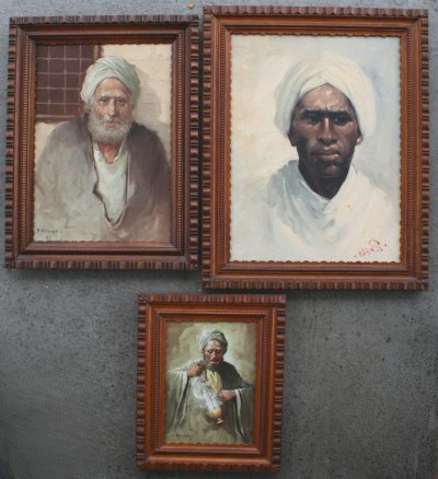 3 MIDDLE EASTERN PAINTINGS: 1) Old man with incense, Oil/C, 9 1/2'' x 6 1/2'', signed, framed, 12'' x 10''; 2) Large Painting Man With Turban, Oil/C, 16'' x 12'', signed, framed, 19'' x 15''; 3) Small Painting Man With Turban, Oil/CB, 14 1/2'' x 10 1/2'', signed, framed, 17'' x 13''. Est. $200/400**