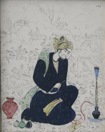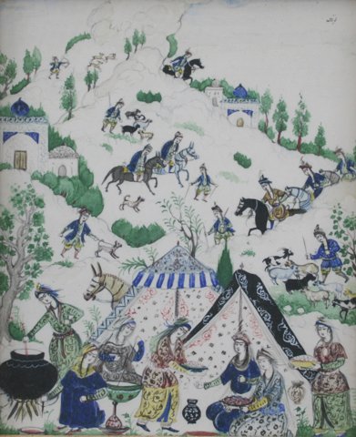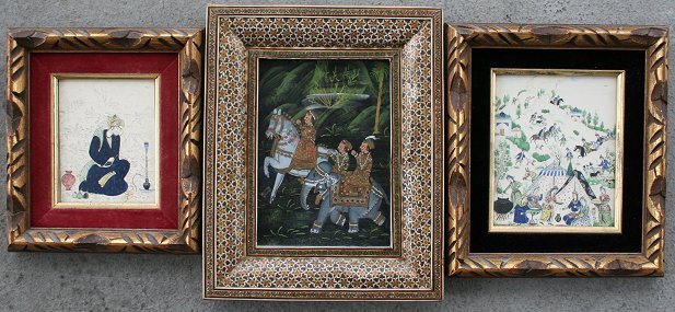 3 PIECE GROUP IRANIAN? PAINTINGS: The largest, a genre scene with intricate inlaid frame, measures 10 1/2'' x 9'', the smaller 2 watercolors on paper measure 4 1/2'' x 3 1/2'' , and 5 1/2'' x 4 1/2'', and they are much more detailed pieces, with illegible signatures, framed, 6'' x 5''. Est. $200/400**