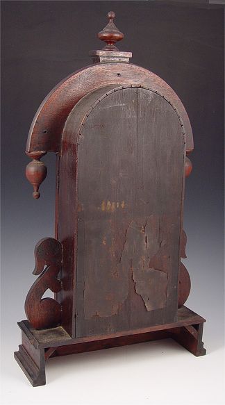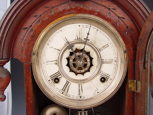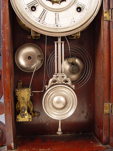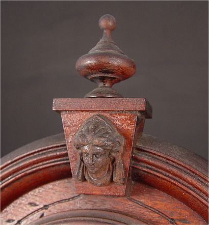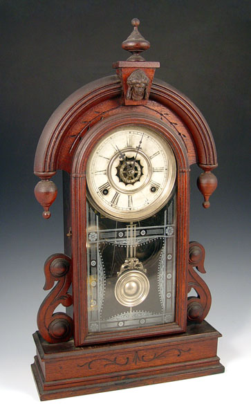 ANSONIA PARISIAN MANTLE CLOCK: Dark walnut case with applied cabochon, note finish. Etched glass front. Metal face, key and pendulum mechanism. Remnants of dark paper label on back. Measures 23'' high x 12 3/4'' wide x 4 3/8'' wide. Key and pendulum in office.