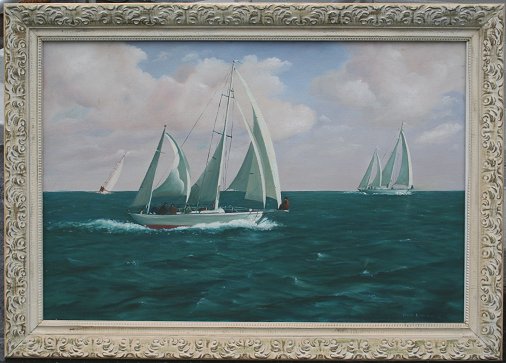 HAWKINS, Frank S., (American, 20th C.): Sailing Yachts, OIL/Canvas, 24'' x 36'', signed and dated 65, framed, 29 1/2'' x 41''. Mild cracklure.