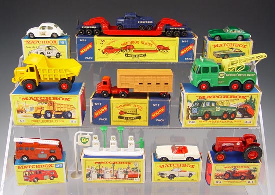 10 ASSORTED LESNEY MATCHBOX CARS WITH BOXES: To include 1) Moko Lesney 200 Ton crane Transporter, No. 6. 2) Jennings Cattle Truck, No. 7. 3) Heavy Breakdown / Wreck Truck, K-12. 4) Foden Dumper Truck, K-5. 5) International Tractor, K-4. 6) Garage Pumps & Sign, A-1. 7) Mercedes Benz 230SL, 27. 8) Ferrari Berlinetta, 75, note undercarriage. 9) Superfast Merryweather Fire Engine, 35. Superfast Volkswagen Beetle, 15. Cars may show minor play condition unless more serious issue noted. All boxes have various condition issues from storage.