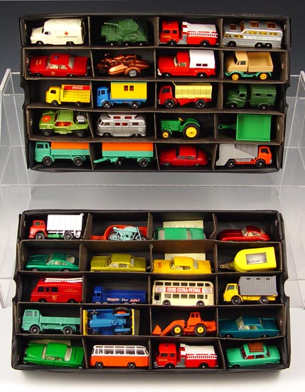 40 ASSORTED VINTAGE LESNEY MATCHBOX CARS: In vintage 1966 Mattel carrying case. Highlights include 66 Harley Davidson with sidecar, 75 Ferrari, 13 Baja Buggy, 67 ''Saladin'' Armored Car, 68 Mercedes Coach, 32 ''E'' type Jaguar, and many others no repeats. Cars show minor play condition. No boxes with these. Case measures 3 3/4'' x 13'' x 8 1/4''.