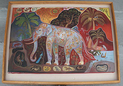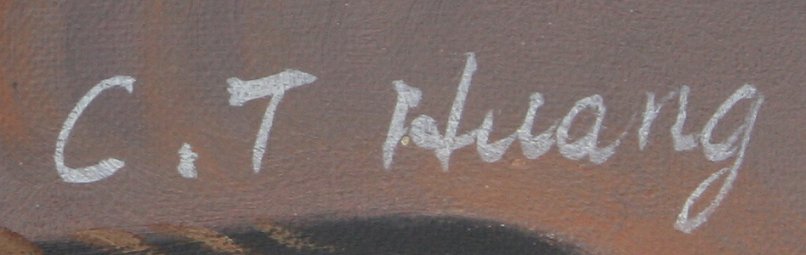 HUANG, C.T., (Asian, 20th C): Fantasy landscape with elephants, animals and supernatural creatures, OIL/C in shadowbox style frame, canvas approx. 28'' x 43 1/2'', signed, overall 35 1/2'' x 48 1/2''.