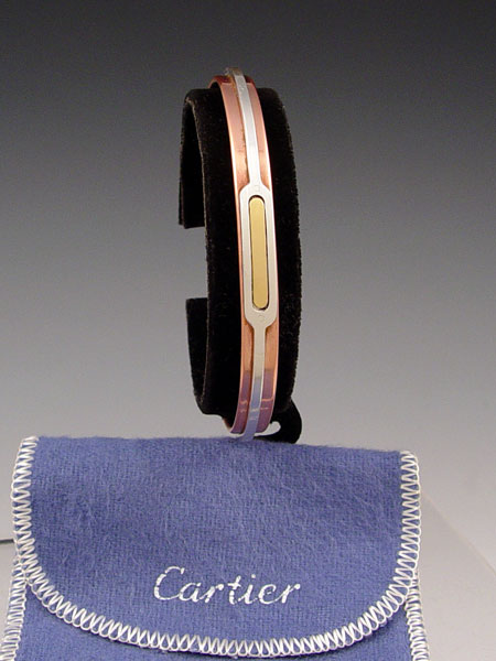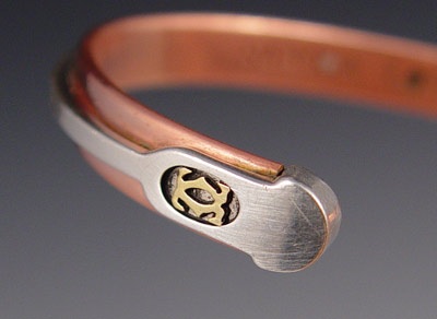 CARTIER SABONA COPPER, STERLING AND 18K CUFF BRACELET: Marked Cartier 18k 925 and Sabona London Rec No. 800834 Made in Ireland, opening approx. 2'' x 2 7/8'', .795 troy oz. With small blue Cartier bag.