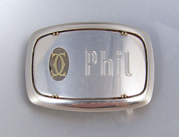 CARTIER 18K AND STERLING BUCKLE: 1 7/8'' x 1 1/4'', marked Sterling 18k Cartier, monogrammed Phil, .910 Troy Oz.
