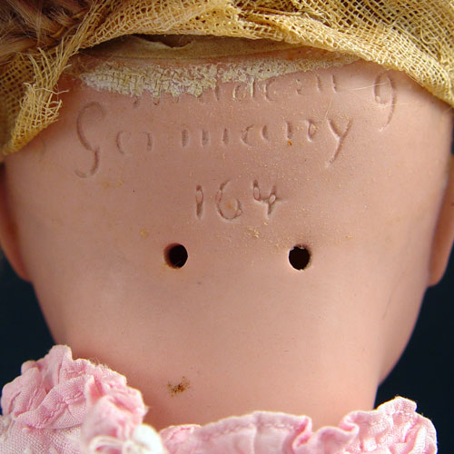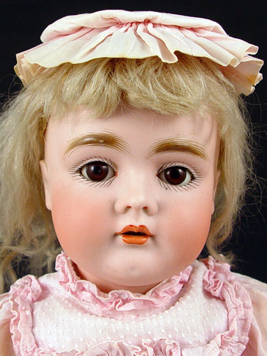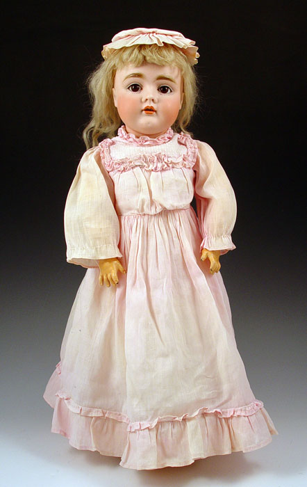 GERMAN KESTNER PORCELAIN HEAD DOLL: Marked ???? Germany 164 on back of head. Open brown glass eyes, open mouth with teeth showing, dimpled chin eyes, fully jointed composition body, dressed pink cotton gown with crinoline. 18'' tall.