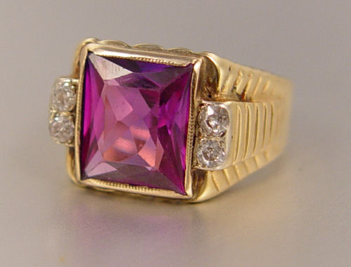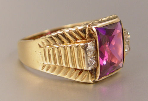 GENTS 14K DIAMOND AND SPINEL RING: 14K yellow gold ring contains 4 old mine cut diamonds (3 diamonds are chipped). Weight: .20 Ct. Rated I1 in clarity and H-I in color. One square faceted 12.00 x 12.00 mm synthetic pink spinel. The diamonds are prong set. The spinel is bezel set. Weight: 7.7 grams Size: 9.5