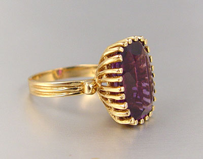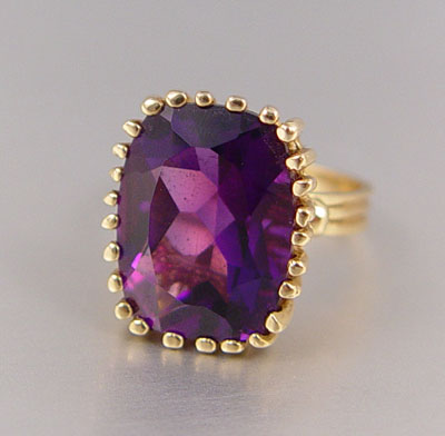 10 CT CUSHION CUT AMETHYST RING: 14K yellow gold ring contains one rectangular cushion cut amethyst. WEIGHT: 10.00 Ct. Approx. Rated VVS in clarity, P in Hue, 4 in Tone and 3-4 in Saturation. The stone is prong set. Weight: 7.6 grams. Size: 6.75