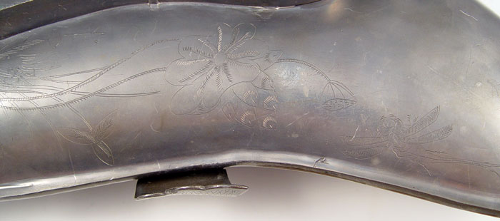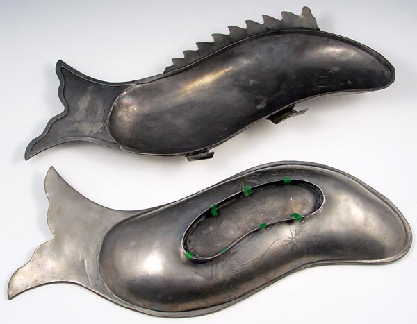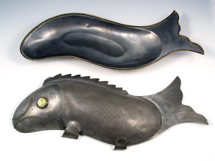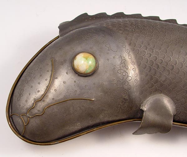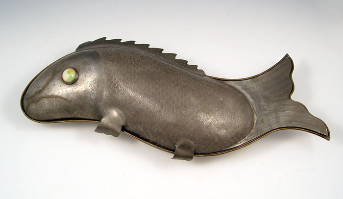 TURN OF THE CENTURY CHINESE PEWTER CARP FORM COVERED DISH: Covered carp with cabochon stone eye. 19'' long, 3 1/2''h.