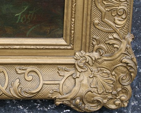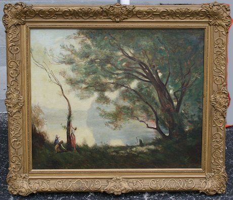 BARBIZON STYLE PAINTING OF FIGURES ALONG A RIVER'S EDGE: OIL/C, 24'' x 30'', signed Tosti, encased in embossed and gilded classical style frame with over paint, 30'' x 36''. Condition - Has been re-lined.