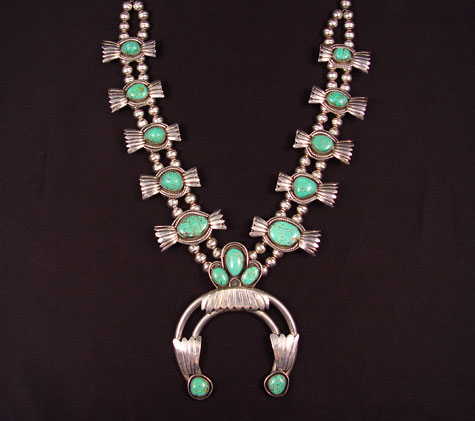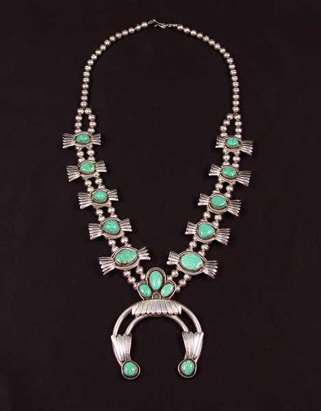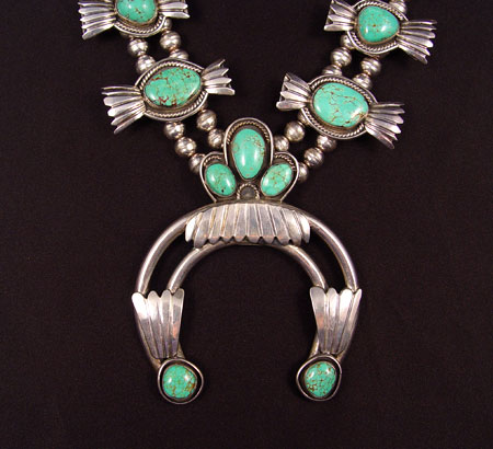 BLUE MESA SQUASH BLOSSOM STERLING TURQUOISE NECKLACE: 28 1/2'' long with 4'' naya. No signature noted.