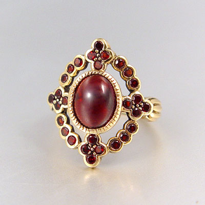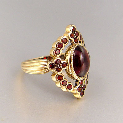 VICTORIAN STYLE GARNET RING: 10K yellow gold ring contains one oval shaped cabochon cut garnet and 28 round mixed cut garnets. Total weight approx. 5.00 Ct. The garnets average VS-SI in clarity (Type II), slpR in Hue (brown modifier), 4-8 in Tone and 2 in Saturation. All stones are bezel set. Weight: 5.2 grams. Size: 7.25