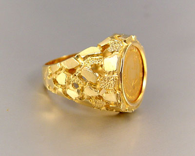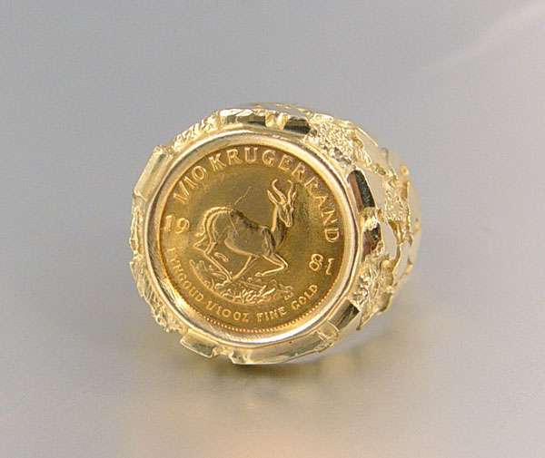 1981 1/10 GOLD KRUGERRAND IN 14K GOLD NUGGET RING: Krugerrand set in 14k yellow gold size 9 ring. Total weight approx 15.7 grams. Est. $450/550**