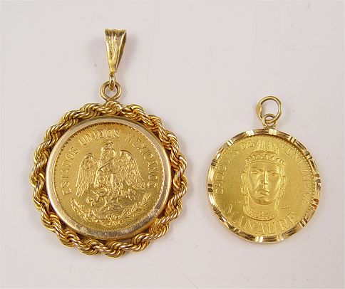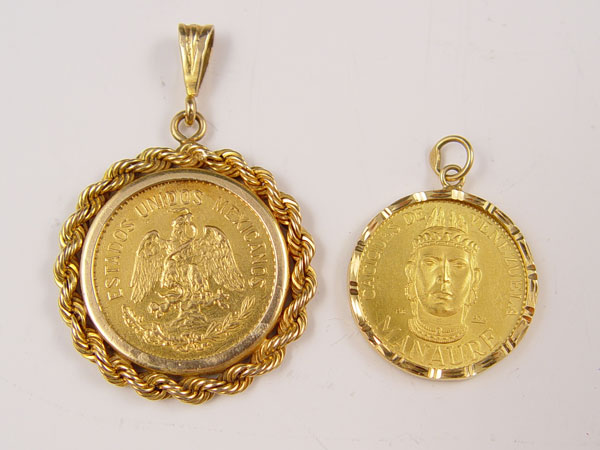 1906 MEXICAN 10 PESO & VENEZUELA MANAURE GOLD COINS: To include 1906 Mexican 10 peso gold coin, rope bezel set for pendant, 90% gold Caciques de Venezuela Manaure commemorative coin, bezel set for pendant.