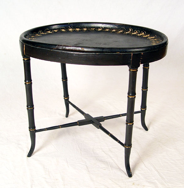 19TH C PAPER MACHE TRAY ON STAND: Paint decorated and lacquered oval tray, bamboo carved stand. 21''h. x 24 1/2'' x 19''. Please note age related chips on lacquer