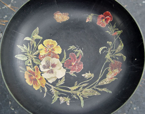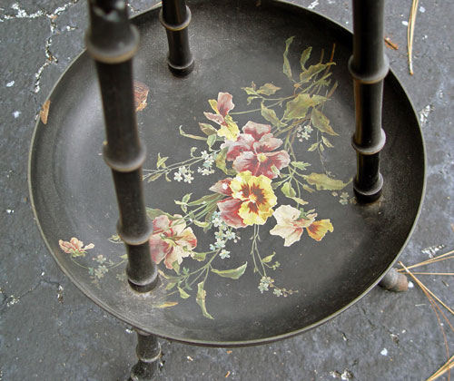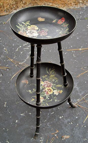 19th C PAPER MACHE TIERED STAND: Hand painted bowls on bamboo turned legs. Measures 30'' high x 13 3/4'' dia.