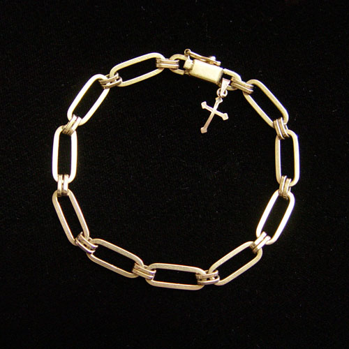 14K GOLD OPEN LINK GOLD BRACELET: 14K yellow gold elongated oval link bracelet with a small cross charm attached. Box clasp with figure eight safety clasp. Approx. 7 1/4'' in length. Weight: 9.6 grams.