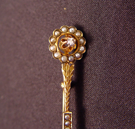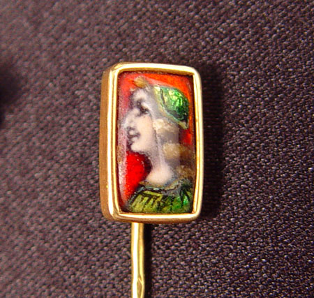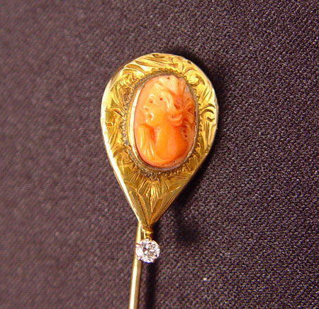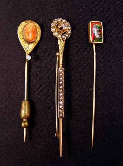 ESTATE LOT OF VINTAGE STICK PINS AND BROOCH: 1) 10K yellow gold brooch depicts a stylized scepter. Half seed pearls and one 2.50 mm white sapphire. Weight: 3.9 grams. 2 3/4'' long. 2) French 18K yellow gold stick pin with enamel on copper portrait, signed Limoges. French hallmarks. Weight: 1.5 grams. 3) 14K yellow gold stickpin with coral cameo and one .05 Ct. old European round cut diamond. Weight: 2.6 grams.
