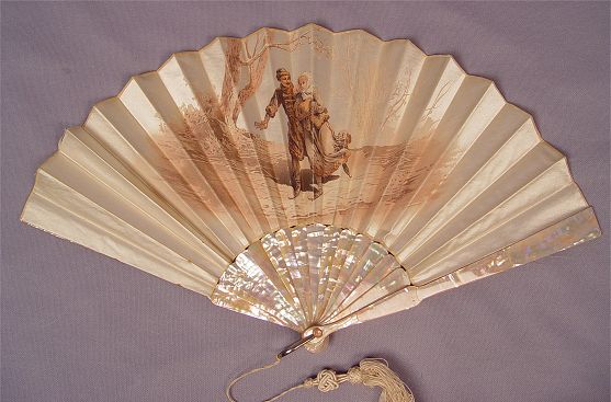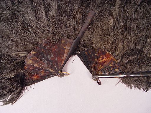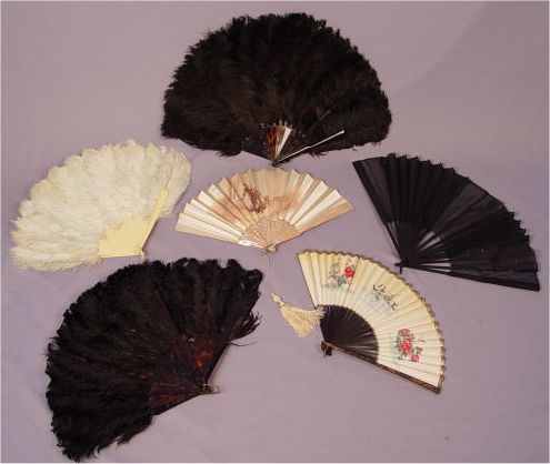 COLLECTION OF 6 VINTAGE FANS: 1 and 2) Black feather and tortoiseshell, please note one has a separation, each approx. 15'' 3) Scenic mother of pearl and silk fan, 10'' long 4) Hand painted oriental wood and paper fan with some loss of paint on the wood, 11''. 5) Wood and sequin fan, 13 1/2'' long and 6)Ivory type celluloid and white feather fan, 14''.