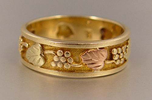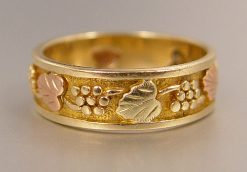 TRI COLOR 14K BLACK HILLS WEDDING BAND / RING: 14K tri colored, rose, white and yellow gold wedding band. Grape and leaf design. Size: 10.5 Weight: 6.8 grams.