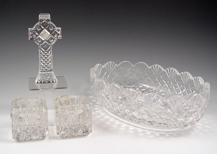 4 PIECE WATERFORD CRYSTAL: 1) Large oval bowl, 4''h x 10 3/4 '' long. 2) Crystal cross, 5 1/2''h. 3-4) Two Lismore votive or stick candle holders in their original boxes. 2 1/2''h, 2'' square. All pieces are signed.