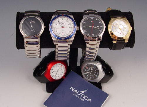 ESTATE LOT OF 6 MEN'S WRIST WATCHES: To include, SKAGEN DENMARK, Stainless Steel, Water Resistant, case #256LSXB, quartz movement, attached steel band; NAUTICA, Stainless Steel, Water Resistant 100 meters, case #N12526, attached steel band, book; two TOMMY HILFIGER - Stainless Steel, Water Resistant to 99 ft, case #T10162, attached steel band and Gold tone Stainless Steel, Water Resistant to 165 ft, case #F90293, brown leather band, 9 1/4''l.; two SWISS ARMY VICTORINOX - same style - one red case with white dial, one silver/gray case with black dial, black rubber straps, approx. 9 1/2''l. Sold as a lot.