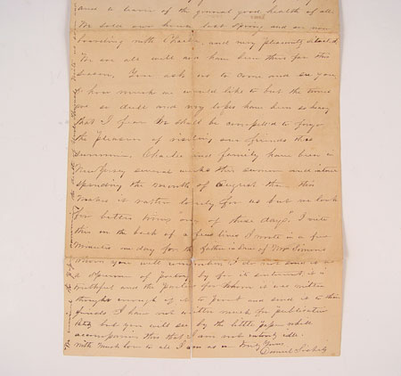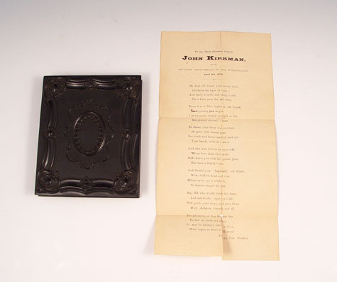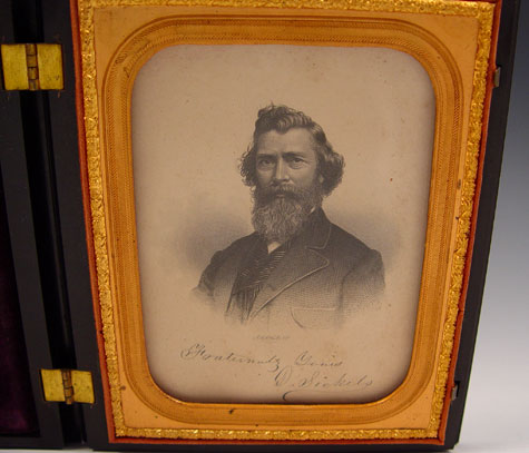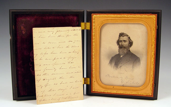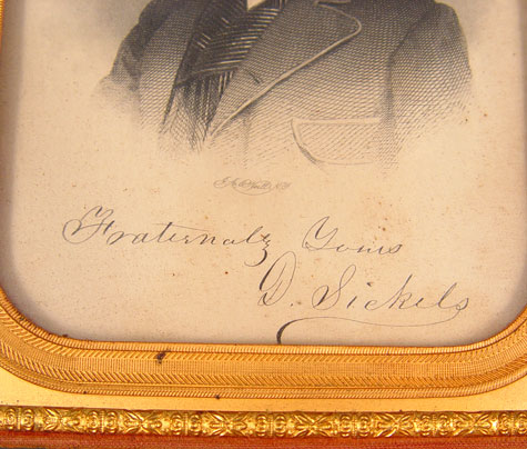 DANIEL SICKELS MASONIC AUTHOR ENGRAVING & LETTER IN GUTTA PURCHA CASE: Steel engraving of noted Masonic author Daniel Sickels, signed Fraturnaly Yours D. Sickels. In large gutta purcha case. Also included is a letter dated 1874 to his niece written on back of a poem to a friend on his 50th wedding anniversary. Note tears in fold lines. Case measures 6 3/8'' x 5 1/4'', note chip.