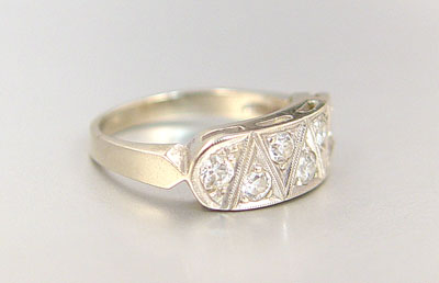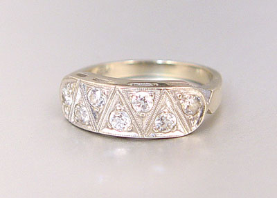 ART DECO 14K OLD EURO CUT DIAMOND BAND RING: Circa: 1930's. 14K white gold wedding band contains 7 old European round cut diamonds. WEIGHT: .45 Ct. Approx. The diamonds average VS in clarity and H in color. The diamonds are bead set. Miligrain detail. Weight: 2.9 grams. Size: 5.25