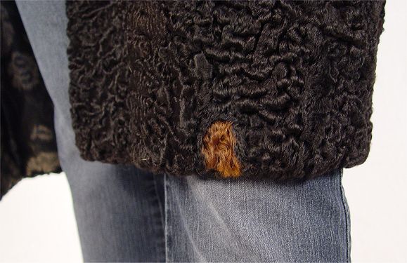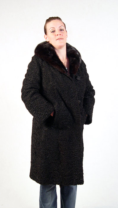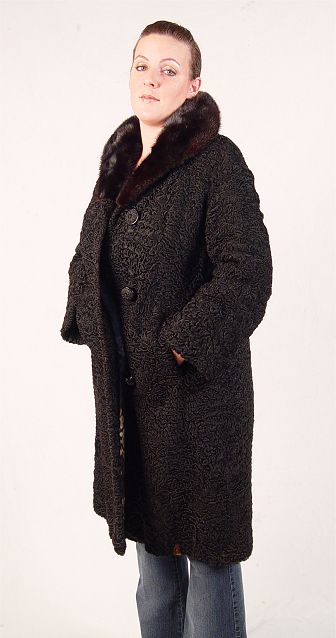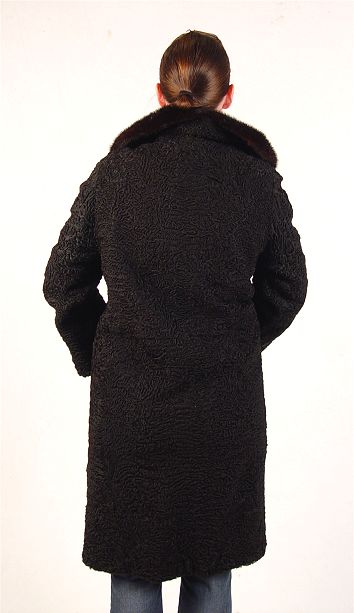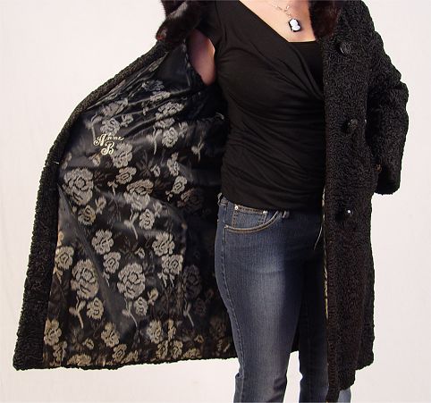 VINTAGE PERSIAN LAMB & MINK COAT: Fur collar on full length Persian lamb coat. Approx. 42'' long , 18'' shoulder to shoulder.