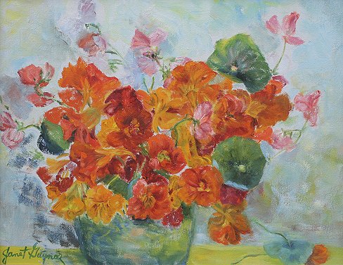 GAYNOR, Janet, (American, 20th C.): Still Life with Flowers, OIL/Canvas, 18'' x 22'', signed, carved painted frame, 22'' x 25'', Wally Findlay Gallery label verso. Est. $300/500**
