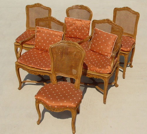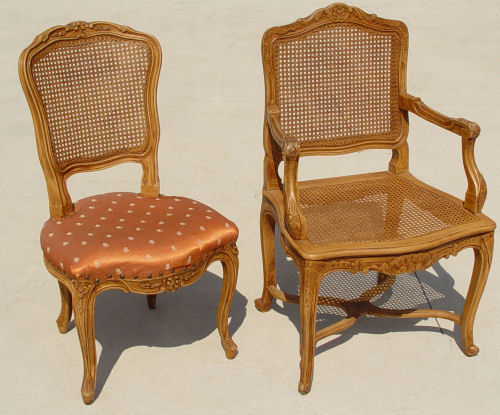 SET OF 6 FRENCH STYLE CHAIRS: Cane backs and seats, 2 arm chairs and 4 side chairs. Carved and molded frames. The arm chairs with curved stretchers. Measure 37 3/4'' high x 23 1/2'' wide x 19 1/2'' deep.