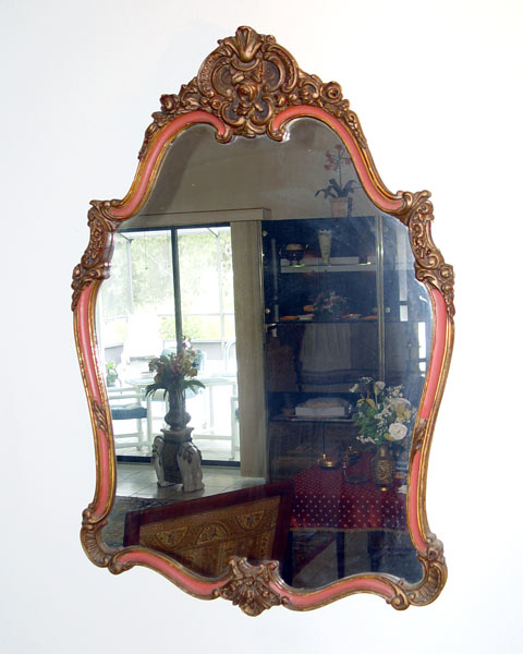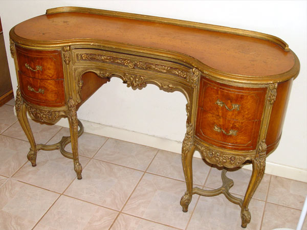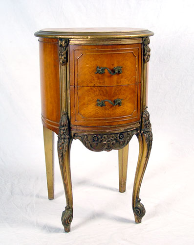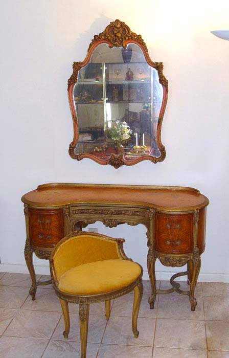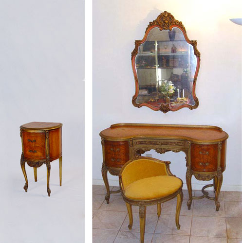FRENCH STYLE VANITY WITH MIRROR, STOOL, & NIGHT STAND: Early 20th C. The set includes 1) Vanity 31'' high x 51 3/4'' wide x 19'' deep. 2) 2 drawer nightstand 29 1/2'' high x 17 3/4'' wide x 15''. 3) Stool 25 1/2'' high x 22'' wide x 19'' deep. 4) Wall mirror 41 1/2'' x 18 1/4''. Please note the finish is worn, the mirror has been repainted.