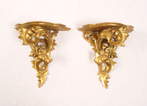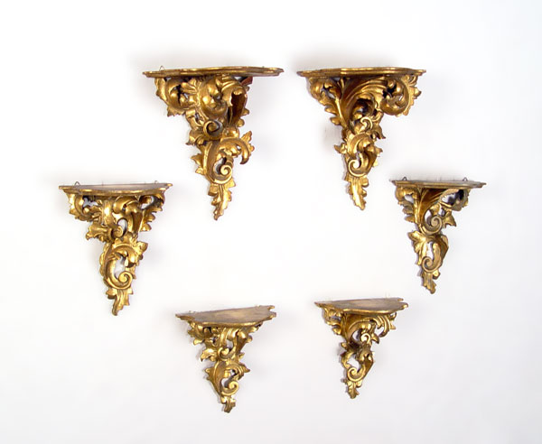 THREE PAIRS ITALIAN ROCOCO CARVED AND GILT WALL BRACKETS: Three sizes, 11 3/4'', 9 3/4'' and 8 1/2''. Please call for condition.