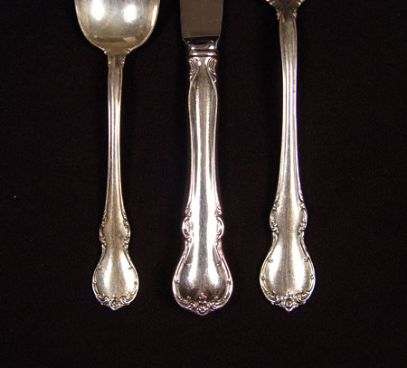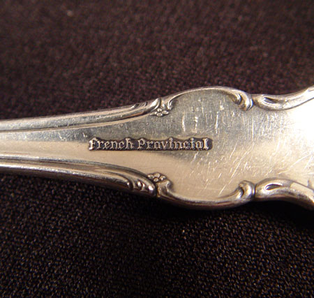 TOWLE FRENCH PROVINCIAL STERLING FLATWARE: 50 pieces in the French Provincial pattern by Towle to include 8 dinner forks (7 1/8''), 8 salad forks (6 3/8''), 8 teaspoons (5 7/8''), 8 round bowl soup spoons (6 1/4''), 2 table spoons (8 1/2''), 8 dinner knives (8 7/8''), 8 hollow butter knives (5 7/8''), carving set (fork 8 1/2'', knife 10''). No monograms. Approx. 53.3 troy oz. Set also includes several stainless steel serving pieces and iced tea spoons.