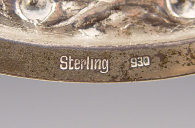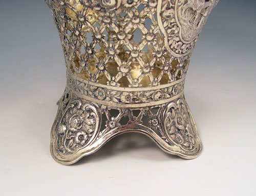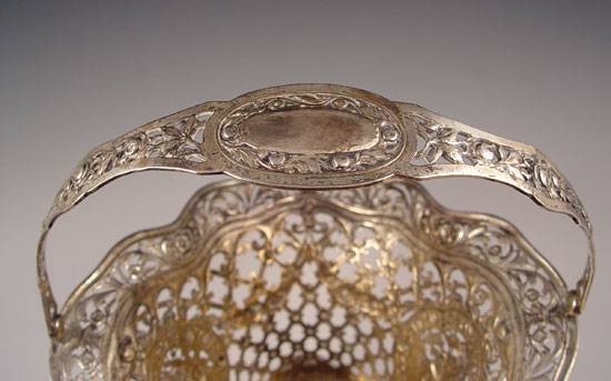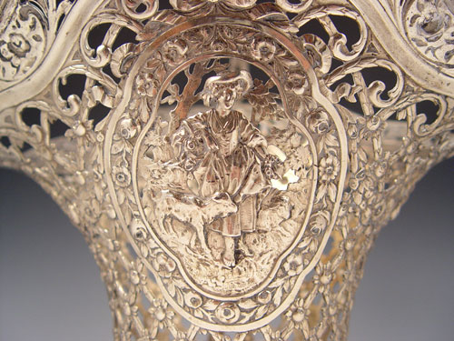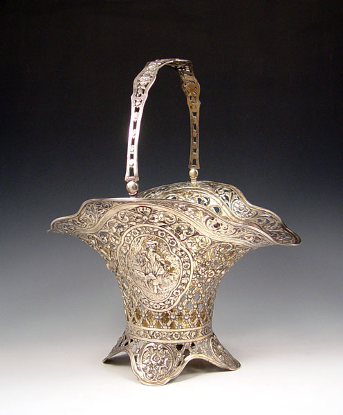MONUMENTAL STERLING RETICULATED BASKET: Reticulated open work garland design with repousse medallions of girl with lamb. Articulated handle. Simply marked Sterling 930 on base and handle, no makers name or hallmarks visible. Note areas of age stain. Measures 9'' high x 12'' x 10 1/4''. Approx 31.9 troy oz.
