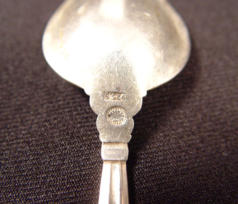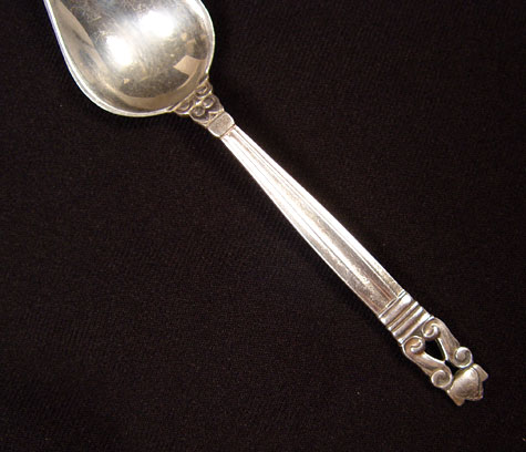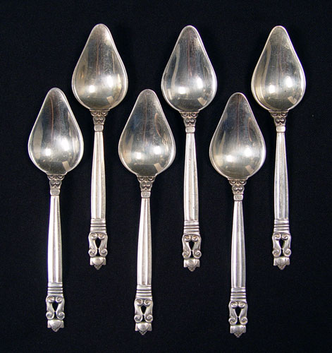 SET OF 6 GEORG JENSEN STERLING INDIVIDUAL GRAPEFRUIT SPOONS: ''Acorn'' pattern, triangular shape bowl. Measures 5 3/4''. Mark indicates 1910-1935. Approx. 5.3 troy oz.