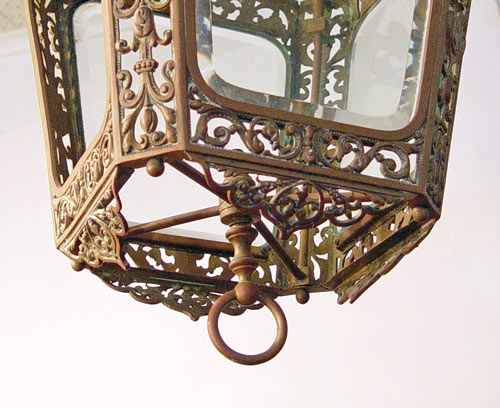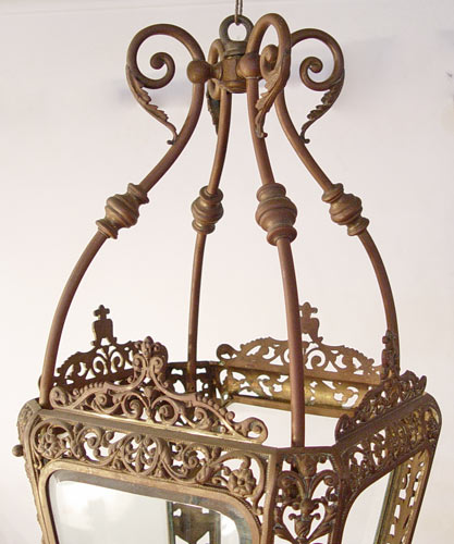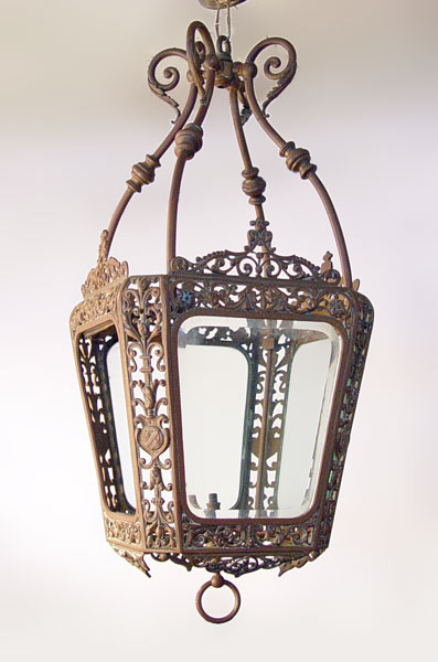 19TH C GAS FIXTURE CHANDELIER: Scroll work and cast metal with gas parts intact. Beveled glass panels, please note one glass panel missing. Approx. 28'' high x 11'' square.
