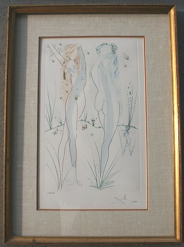 DALI, Salvador, (Spanish 1904-1989): ''Return, return, Shulamite'', from the Song of Songs of Solomon, Drypoint color etching and gold dust, signed in pencil lower right, impression size 15.75'' x 9.75'' (40 cm x 24.8 cm), sheet size 22 1/4'' x 15'', numbered lower left, 98/250, framed, 25'' x 18''. Est. $400/600**