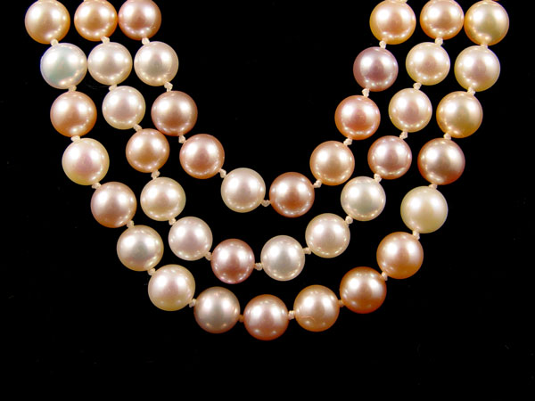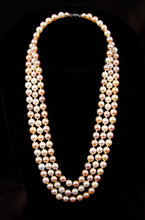 TRIPLE STRAND 7-7.50 mm MULTI-COLORED PEARL NECKLACE: Triple strand of 7.00-7.50 mm multi-colored freshwater pearl necklace. The pearls are white, pink and peach in color. High luster, slightly blemished. 14K white gold square shaped filigree clasp. Overall length: 20''