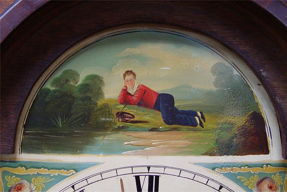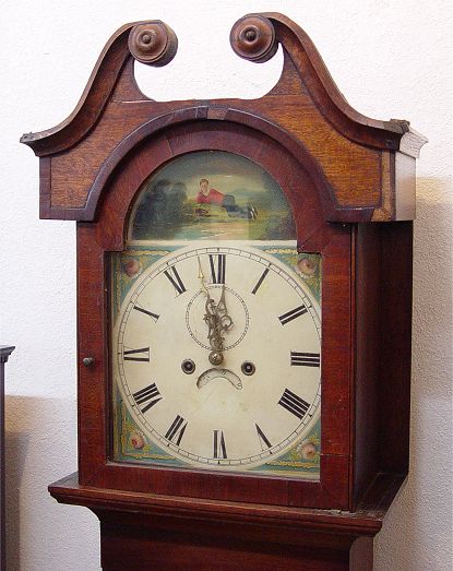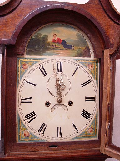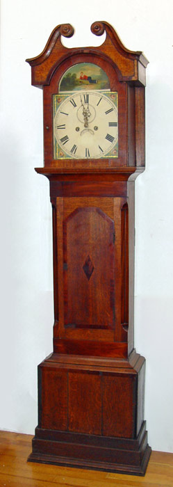 19TH CENTURY ENGLISH HAND PAINTED FACE LONGCASE CLOCK: Hand painted metal face, note condition. Triple movement with secondhand and date. Single weight present, crank mechanism. Scroll pediment, note damage. Veneer chip on case. Measures 77 1/2'' high x 22'' wide x 10 1/2'' deep. Sold as not running.